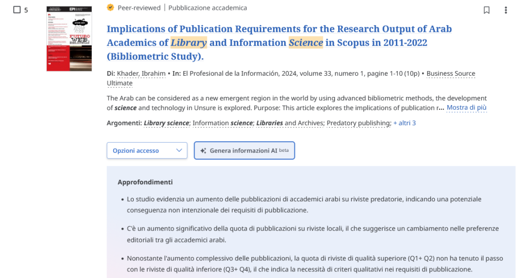 Gli AI Insight vengono visualizzati quando è disponibile il full-text del documento. Alcuni record potrebbero non visualizzare il pulsante “Genera informazioni AI” se il contenuto è troppo breve.